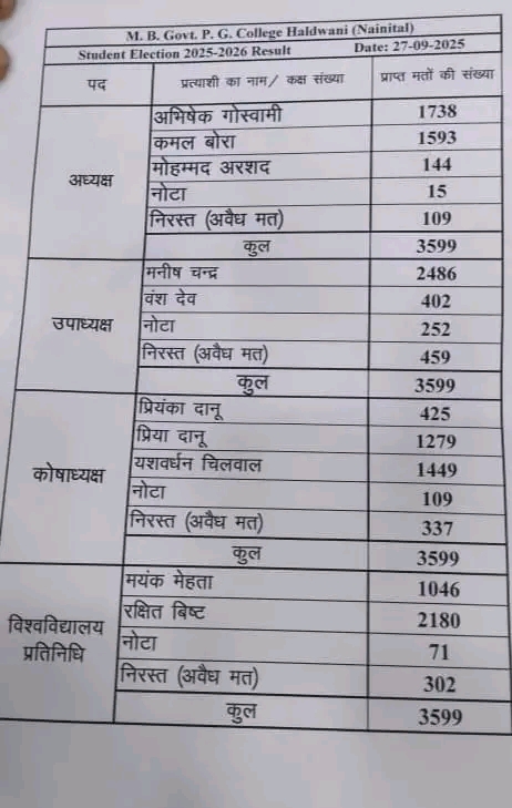 बड़ी खबर : एमबी डिग्री कॉलेज हल्द्वानी में एबीवीपी के अभिषेक बने अध्यक्ष