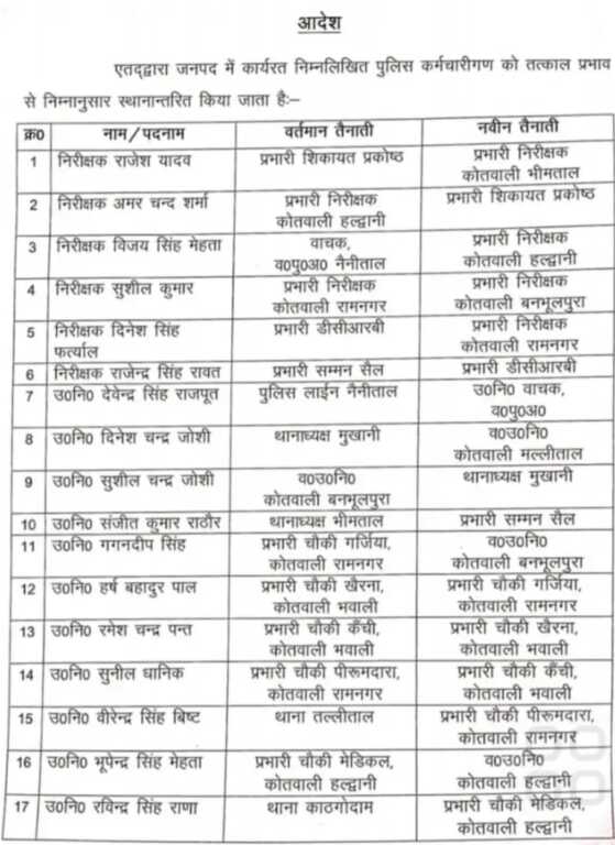 बड़ी खबर : विजय सिंह मेहता होंगे हल्द्वानी के नए कोतवाल… नैनीताल जिले में देर रात बम्पर तबादले