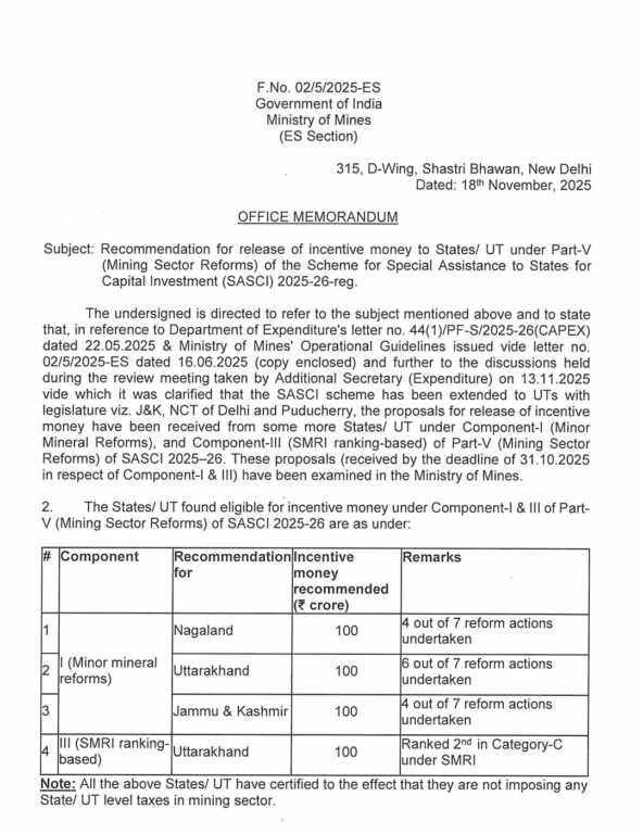 देहरादून। मुख्य मंत्री पुष्कर सिंह धामी के नेतृत्व में खनन क्षेत्र में उल्लेखनीय प्रदर्शन और लगातार सुधारों के चलते उत्तराखंड एक बार फिर केंद्र सरकार से बड़ी प्रोत्साहन राशि हासिल करने में सफल रहा है। केंद्र के ख़ान मंत्रालय ने वर्ष 2025-26 की विशेष सहायता योजना (SASCI) के तहत उत्तराखंड को माइनर मिनरल्स रिफॉर्म्स में 100 करोड़ रुपये की अतिरिक्त प्रोत्साहन राशि प्रदान की है। इससे पहले भी माह अक्टूबर 2025 में राज्य को एसएमआरआई रैंकिंग में दूसरा स्थान प्राप्त होने पर 100 करोड़ रुपये की प्रोत्साहन राशि मिल चुकी है। इस प्रकार खनन क्षेत्र में उत्कृष्ट सुधारों और बेहतर नीतियों की बदौलत उत्तराखंड को कुल 200 करोड़ रुपये की प्रोहोत्सन राशि प्राप्त हो चुकी है।