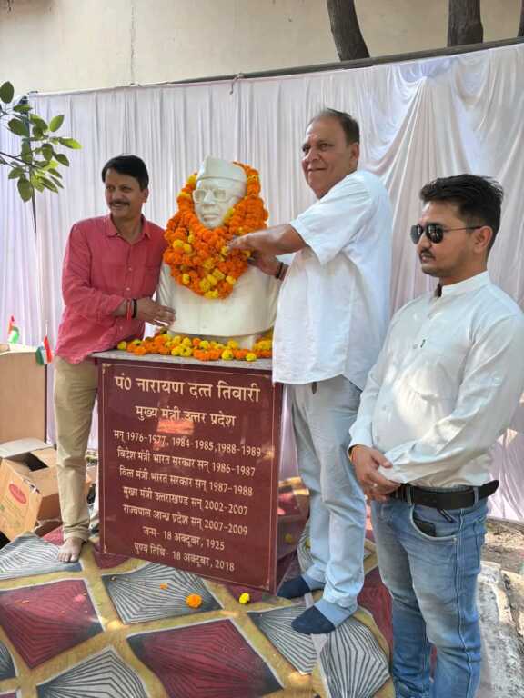 कार्यक्रम के मुख्य अतिथि मंडी परिषद के अध्यक्ष डॉ. अनिल डब्बू रहे, जिन्होंने विधिवत पूजा-अर्चना के साथ प्रतिमा का अनावरण किया।इस अवसर पर डॉ. डब्बू ने कहा कि पंडित नारायण दत्त तिवारी न केवल एक कुशल प्रशासक थे, बल्कि उन्होंने उत्तराखंड के विकास में महत्वपूर्ण भूमिका निभाई। उन्होंने कहा, “तिवारी जी की दूरदृष्टि, विकास के प्रति समर्पण और जनकल्याणकारी नीतियां आज भी हम सभी के लिए प्रेरणा का स्रोत हैं। यह प्रतिमा हमें उनके सिद्धांतों और सेवाभाव की याद दिलाती रहेगी।”