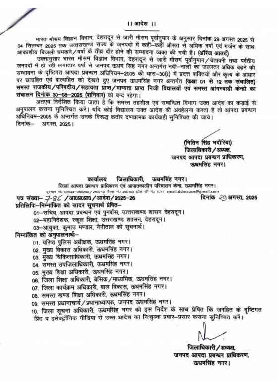 उधमसिंहनगर जिले में भारी रात के चलते शनिवार को स्कूलों की छुट्टी घोषित कर दी गई है।