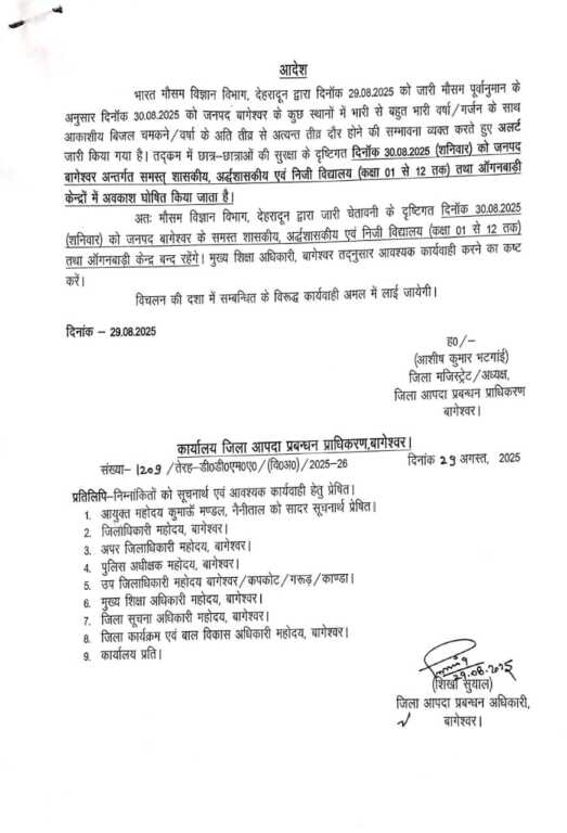 भारी बरसात के चलते कुमाऊं के इन दो जिलों में अवकाश घोषित