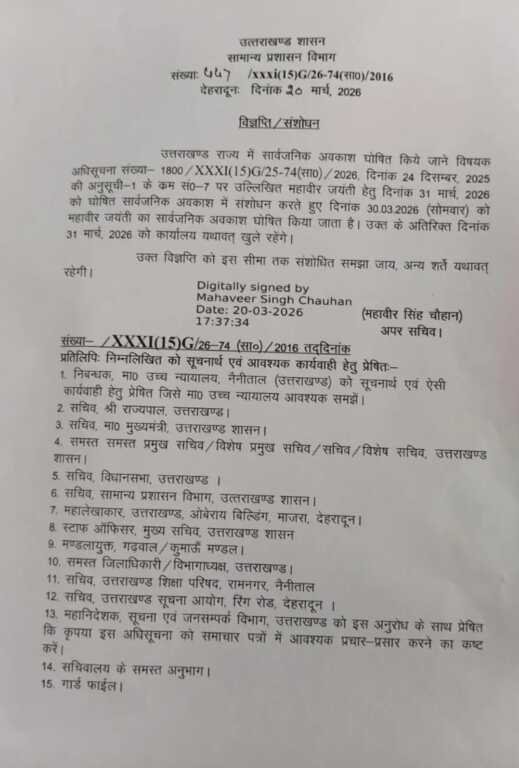 देहरादून: शासन ने महावीर जयंती के अवसर पर घोषित सार्वजनिक अवकाश में संशोधन किया है। पहले यह अवकाश 31 मार्च 2026 को निर्धारित किया गया था, लेकिन अब इसे बदलकर 30 मार्च 2026 (सोमवार) कर दिया गया है।