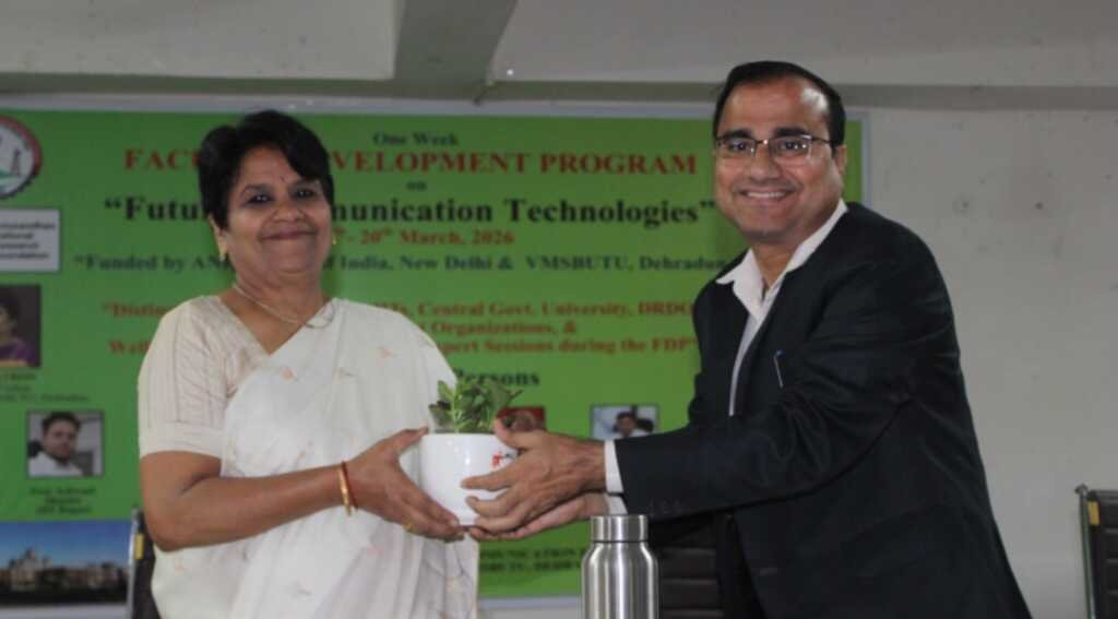 देहरादून। वीर माधो सिंह भंडारी उत्तराखंड प्रौद्योगिकी विश्वविद्यालय के परिसर संस्थान, महिला प्रौद्योगिकी संस्थान, देहरादून में पांच दिवसीय फैकल्टी डेवलेपमेंट कार्यक्रम विषय “फ्यूचर कम्युनिकेशन टेक्नोलॉजी” का विधिवत शुभारंभ डॉ. तृप्ता ठाकुर, माननीय कुलपति महोदया वीर माधो सिंह भंडारी उत्तराखंड प्रौद्योगिकी विश्वविद्यालय, देहरादून द्वारा किया गया।